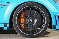 The combination of a carbon front splitter, which is mounted on the underside of the front spoiler, and dive plates, which are mounted on the side of the front valence, ensures excellent aerodynamic properties at the front end. To achieve an ideal aerodynamic balance a carbon wing is mounted at the rear. The profile of the rear wing is such, that it reduces lift at the rear significantly without negatively effecting the drag coefficient. The rear diffusor, in black matt, also plays a part in ensuring that the aerodynamic efficiency at the rear end is improved.